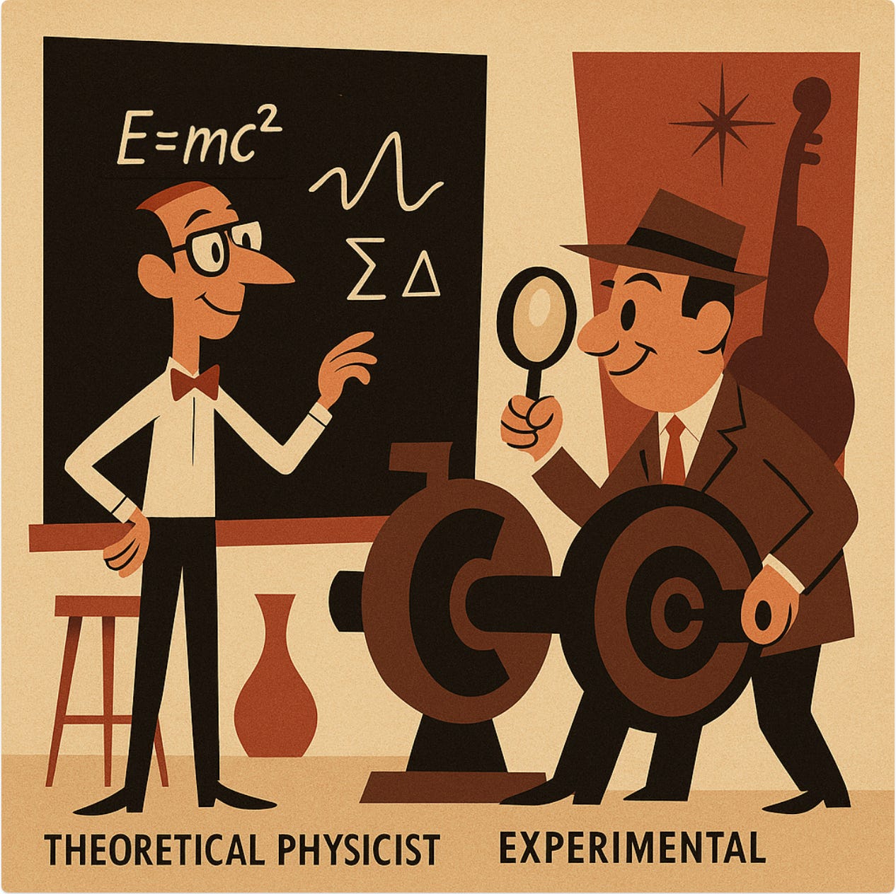 Theoretische Physiker entwickeln Theorien, Experimentalphysiker entwerfen Experimente und Geräte, um diese Theorien zu testen (5Sigma, ChatGPT)