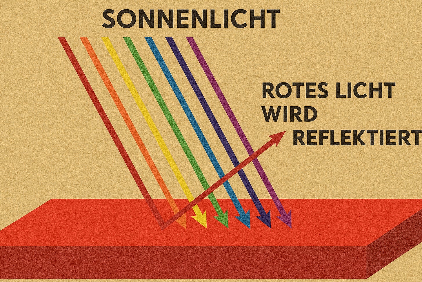 Eine reduzierte grafische Darstellung: Alle Farben werden absorbiert, nur rotes Licht wird reflektiert und erreicht unsere Augen. So erscheint uns dieses Objekt rot. (5Sigma, ChatGPT)