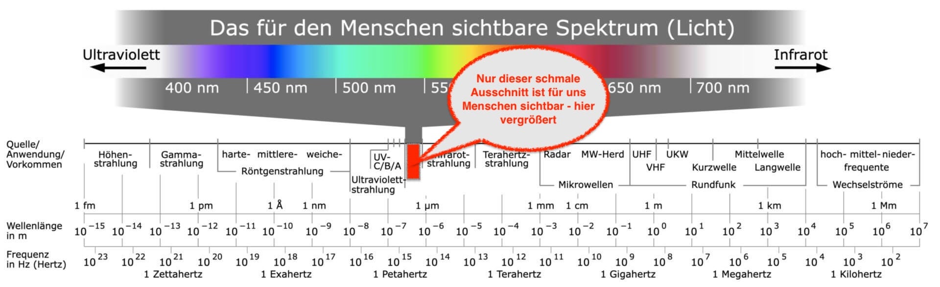 Nun haben wir bereits Beispiele für Wellen im Spektrum betrachtet, die sich nicht unmittelbar erschließen, aber durch Geräte sichtbar und hörbar gemacht werden können. Unser sichtbares Licht dagegen wurde natürlich sehr viel früher entdeckt. War ja nicht zu übersehen.