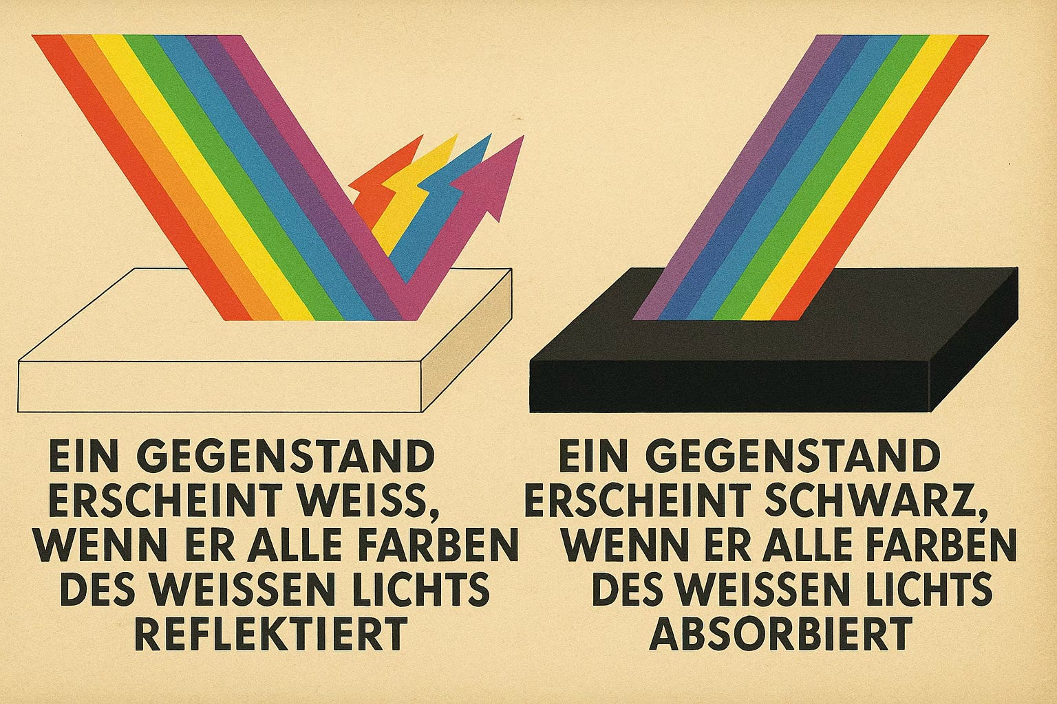 Weiß und Schwarz unterscheiden sich fundamental von allen Farben: Ein Objekt erscheint weiß, wenn es alle Farben weißen Lichts reflektiert und schwarz, wenn es nichts reflektiert. Dann sehen wir nur das Fehlen jedes Lichts. (5Sigma, ChatGPT)
