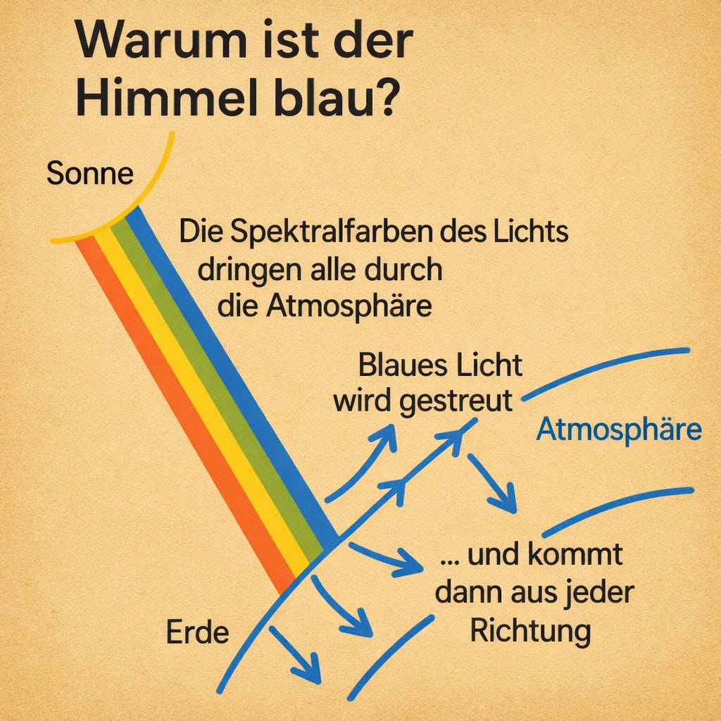 IIch glaube, Sie sind jetzt von dieser Feststellung nicht mehr überrascht: Der Himmel erscheint uns blau, weil er tagsüber in dieser Farbe leuchtet, nicht weil er blau ist. Kleinste Staubpartikel und die Luftmoleküle selbst reflektieren den blauen Anteil im Sonnenlicht untereinander und in alle Richtungen, sodass der Himmel wie eine gigantische blau leuchtende Milchglasscheibe wirkt. Die anderen Farben des Sonnenlichts kommen zentral, aus einer Quelle, das blaue Licht dagegen kommt gestreut aus allen Richtungen, in die wir blicken.